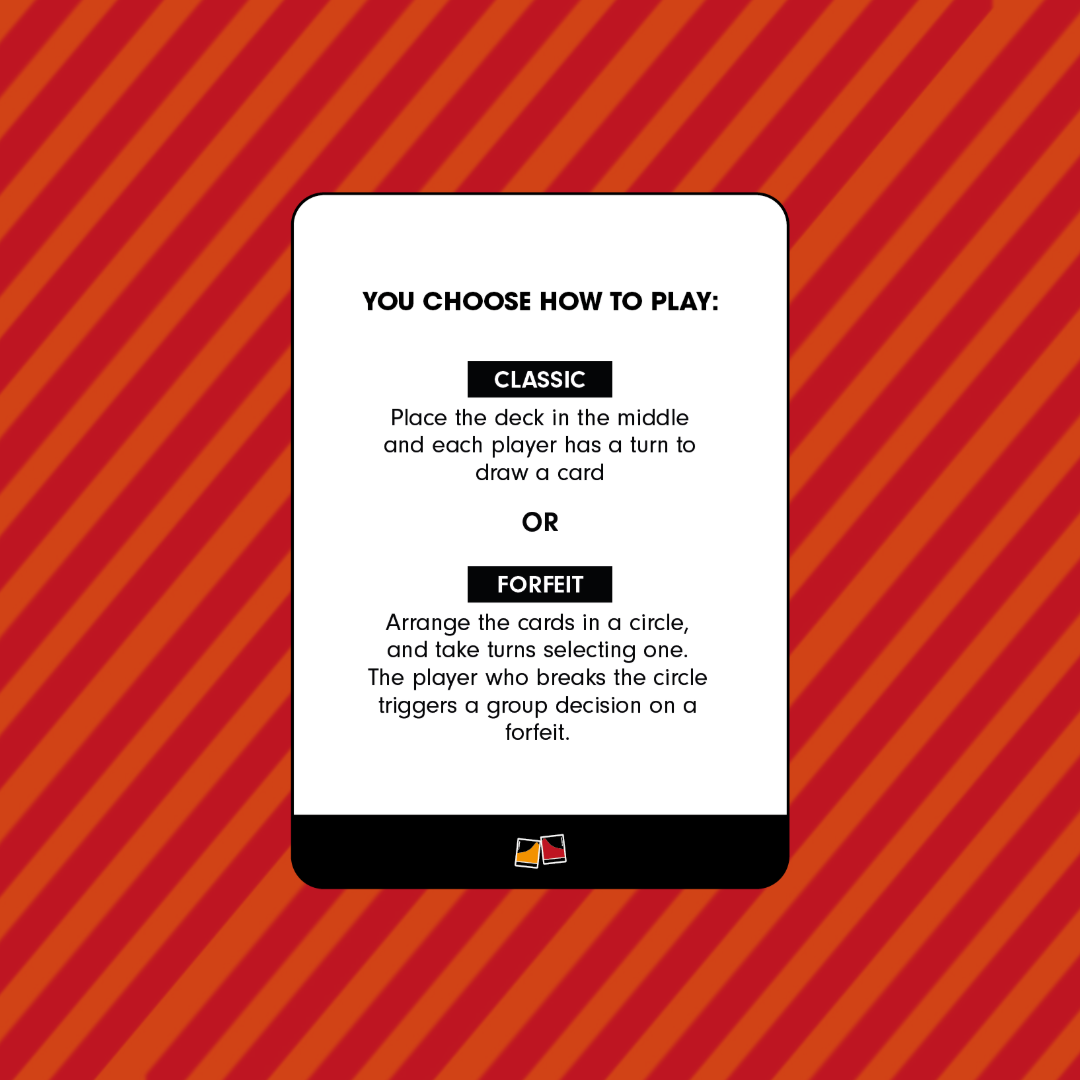 FORFEIT - Arrange the cards in a circle and take turns selecting one. The player who breaks the circle triggers a group decision on a forfeit.